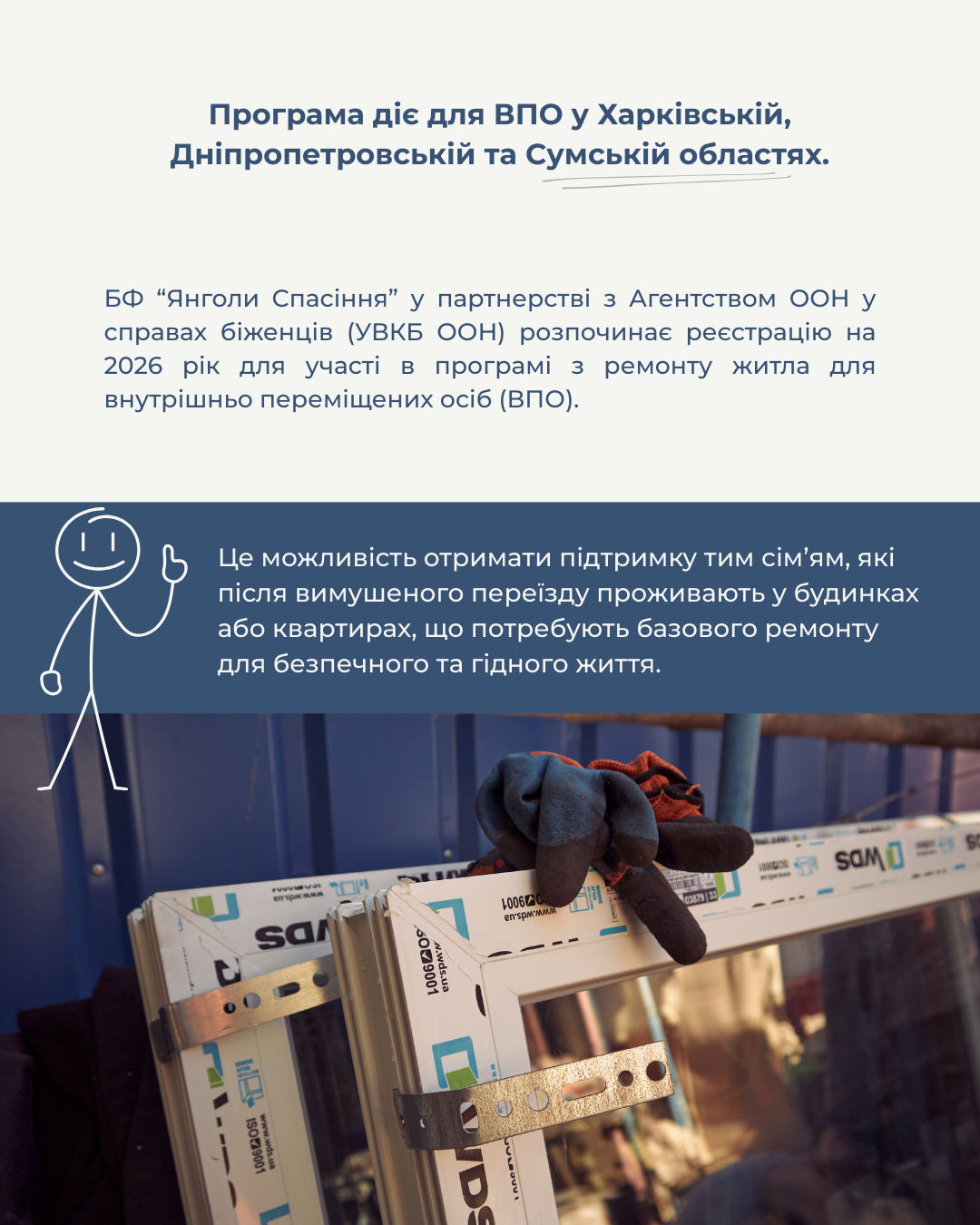 Благодійний фонд «Янголи Спасіння» спільно з Агентством ООН у справах біженців в Україні (УВКБ ООН) оголошує про початок реєстрації на 2026 рік для участі в програмі з ремонту житла для внутрішньо переміщених осіб (ВПО).