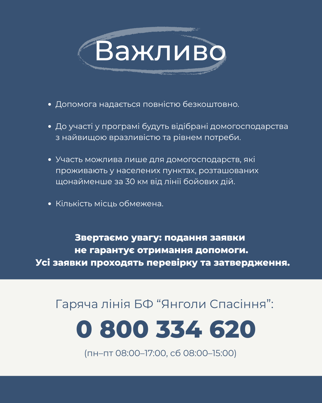 Звертаємо вашу увагу, що подання заявки не гарантує отримання допомоги. Усі заявки проходять ретельну перевірку та затвердження.