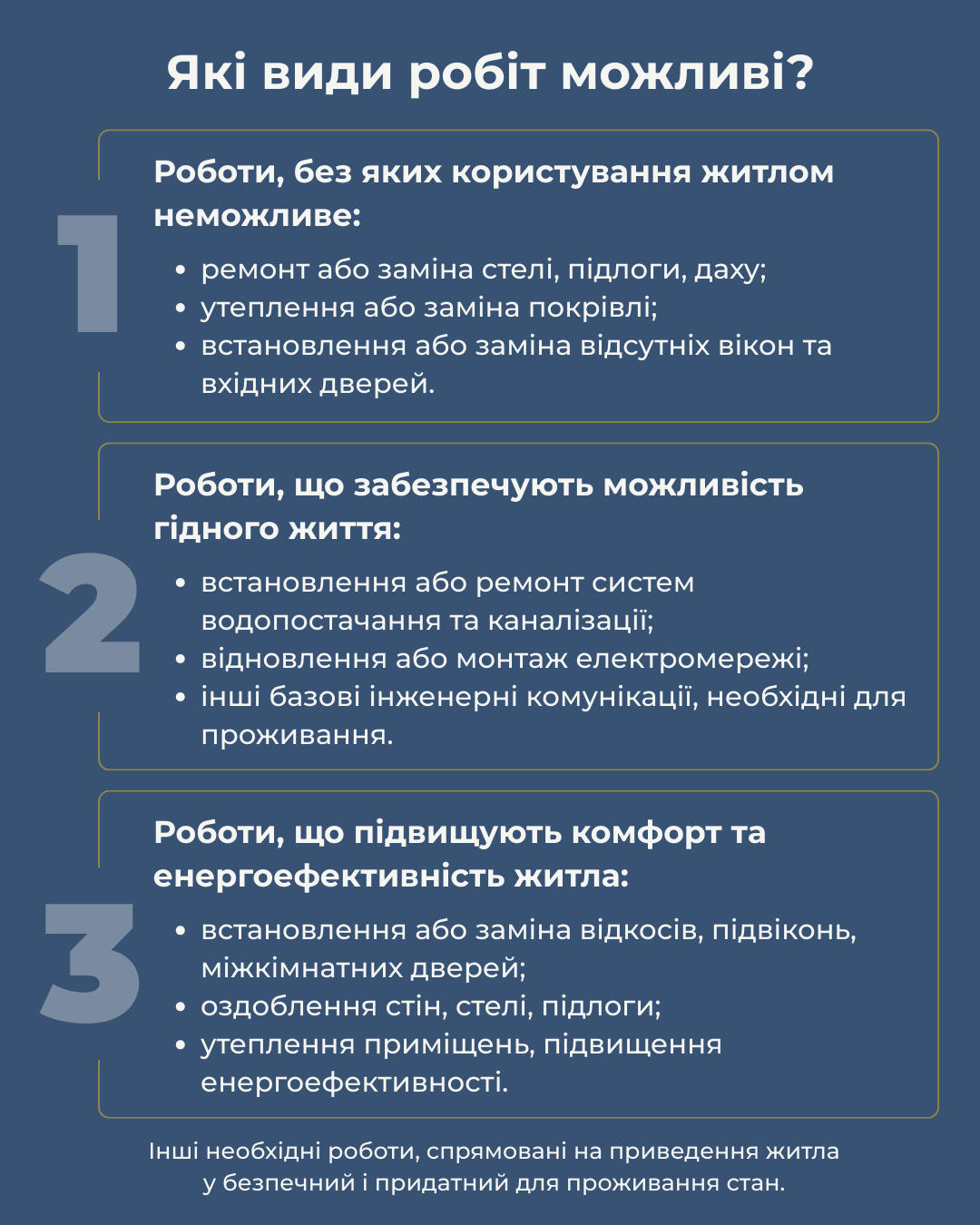 Допомога передбачає виконання найнеобхідніших видів ремонту для забезпечення безпеки та комфортності житла: вікна, двері, дах, підлога, утеплення, водопостачання, електрика, каналізація та інші базові ремонти.