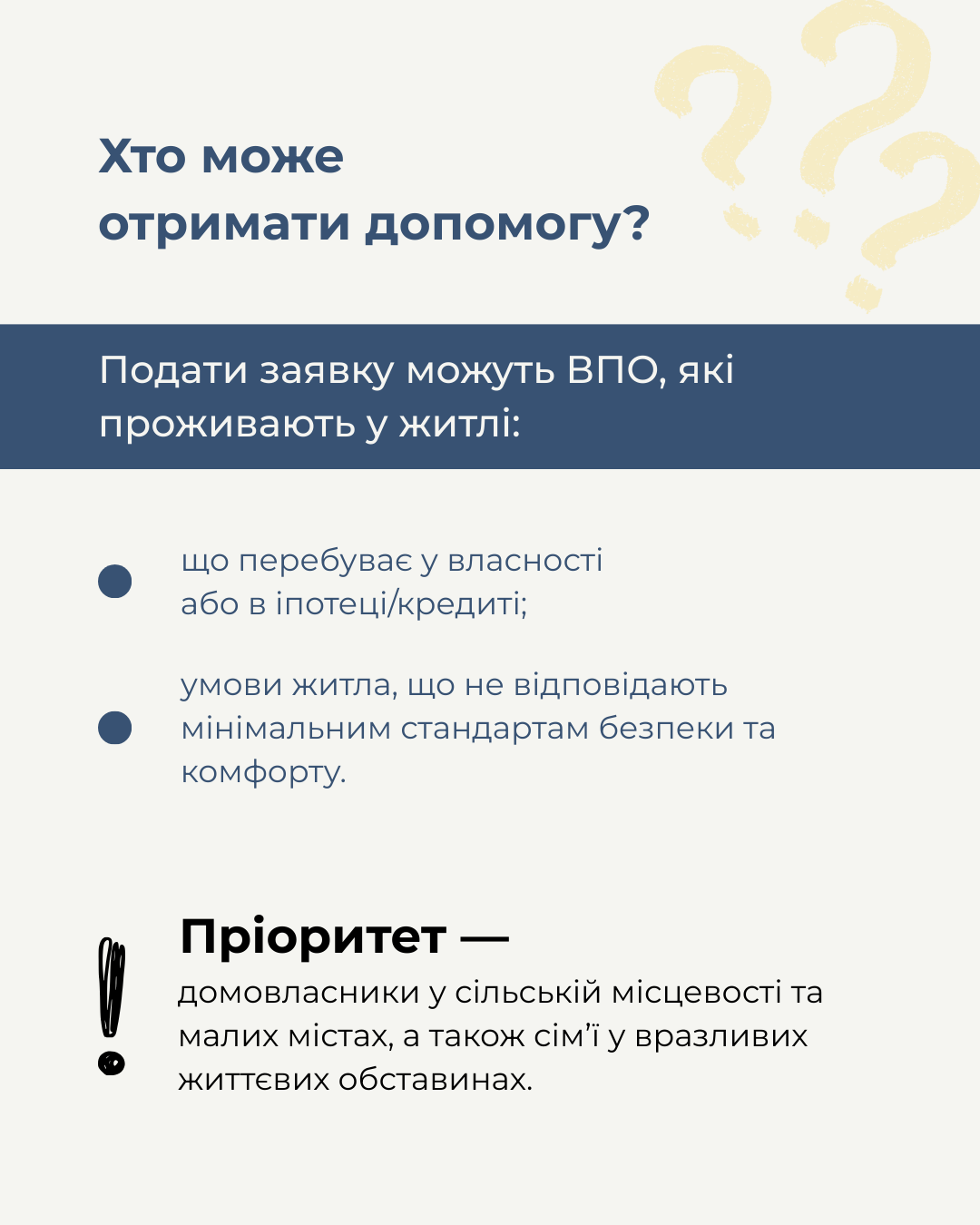 Пріоритет надається домовласникам у сільських населених пунктах та малих містах, а також сім'ям у вразливих життєвих обставинах.